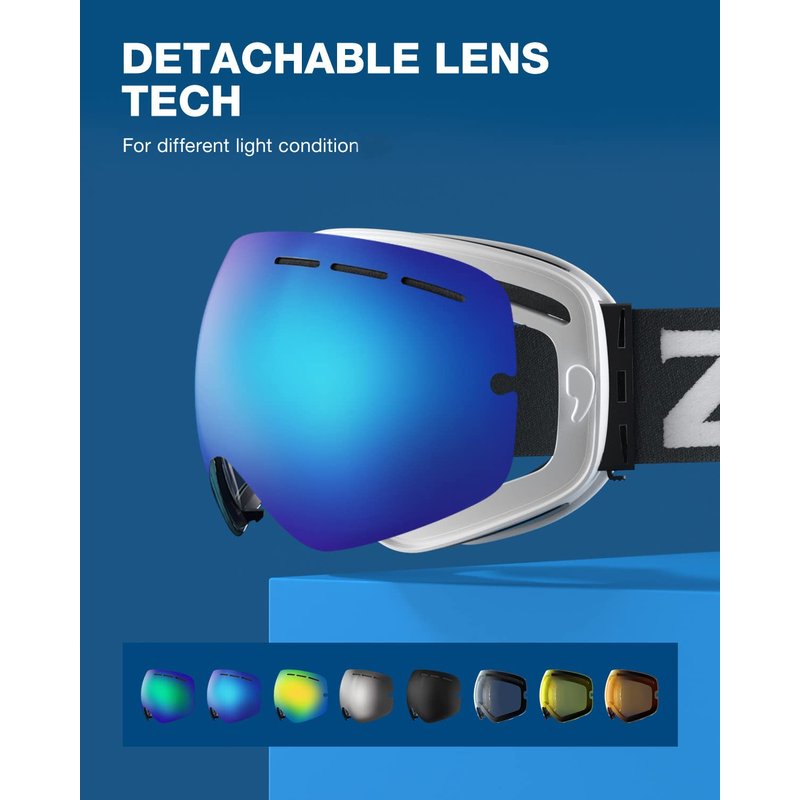 ZIONOR X Ski Snowboard Snow Goggles OTG Design for Men Women Adult with Spherical Detachable Lens UV Protection Anti-fog (VLT 22% White Frame Revo Blue Lens)