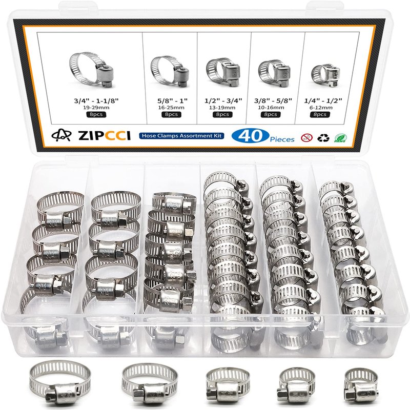 ZIPCCI Hose Clamp Kit, 1/4 Inch - 1 Inch 304 Stainless Steel Hose Clamps Assortment, Worm Gear Fuel Line Pipe Clamp Set, 6-29mm (40pack)