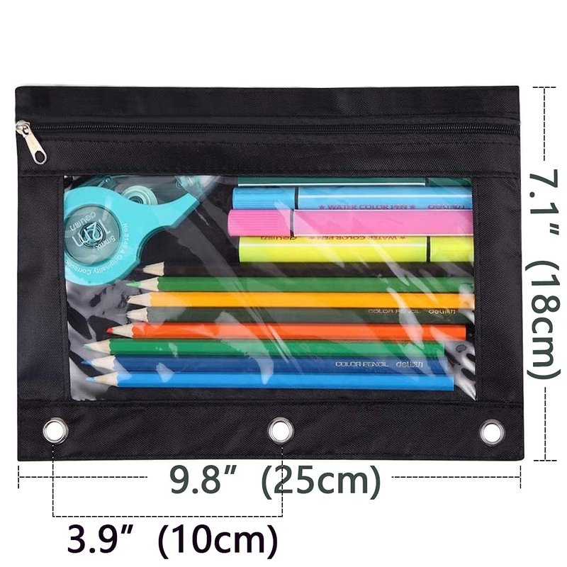 3-ring pencil pouch has three reinforced holes for easily snapping the pencil pouch into your binder. The dimensions of the fabric pencil case are 9.8 x 7-inches. The pouch has clear window that allows you to see what's inside conveniently.