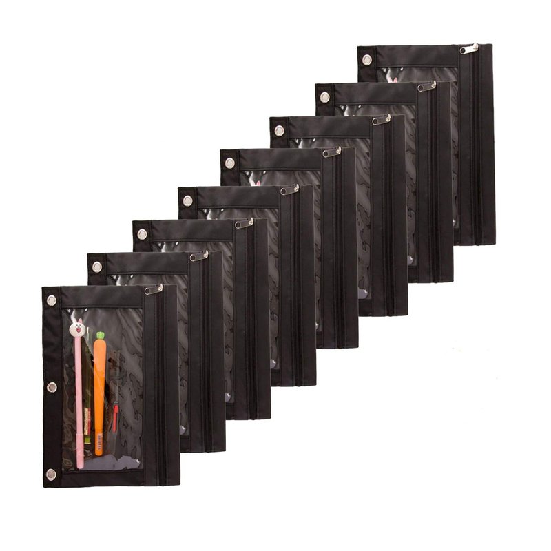Zippered Binder Fabric Pencil Pouch 3 Rings with Clear Window for School Classroom Organizers 8 Pack (Black)