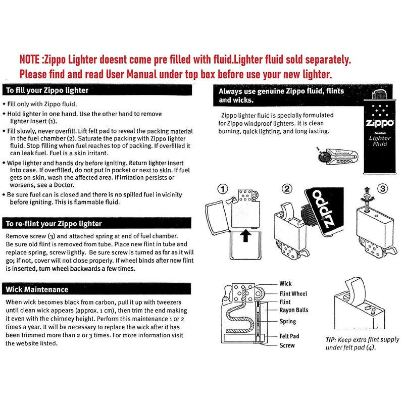 - NOTE: Refer the User Manual before use.Please find user manual under top box.Genuine Zippo windproof lighter with distinctive Zippo "click".