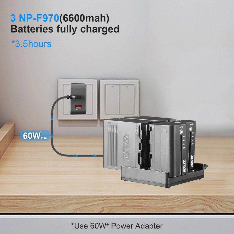 - 3 NP-F970 batteries get fully charged within 3.5 hours simultaneously