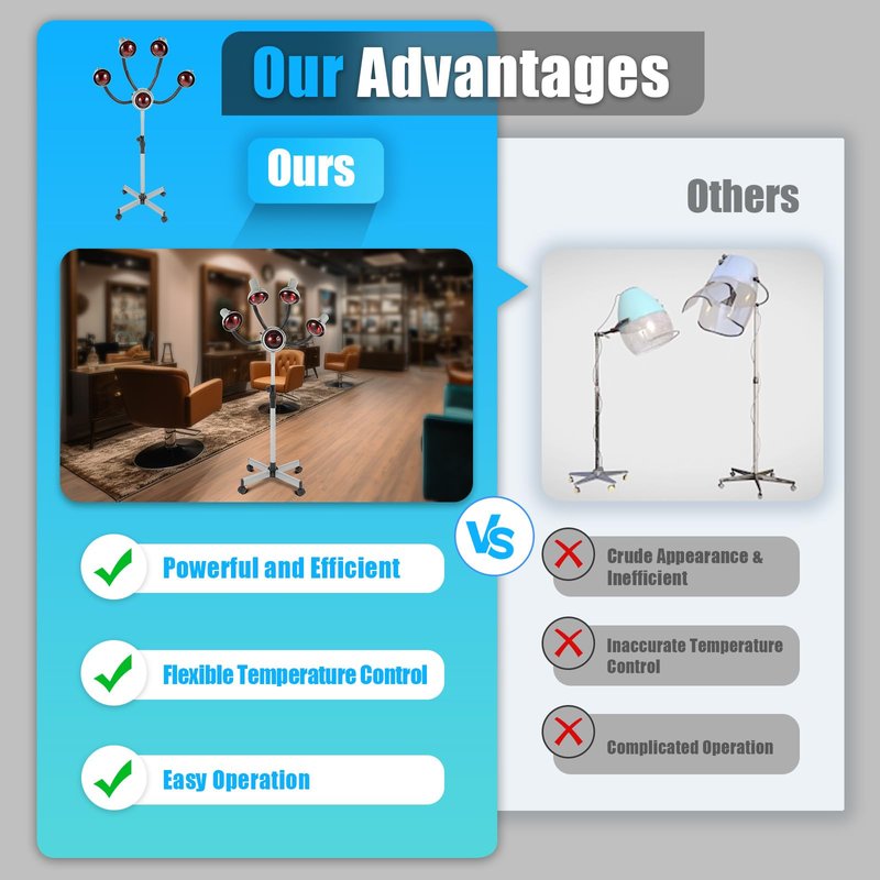 - π©βπ¦±π©βπ¦±γππππ ππ π πππππππγ The high-power machine (750W) adopts quality infrared bulbs to quickly heat up to the desired temperature, and five heating heads conduct heat evenly to the roots of the hair, reducing customer waiting time. Besides, Infrared Lamp can promote blood circulation, accelerate metabolism, and make hair elastic.