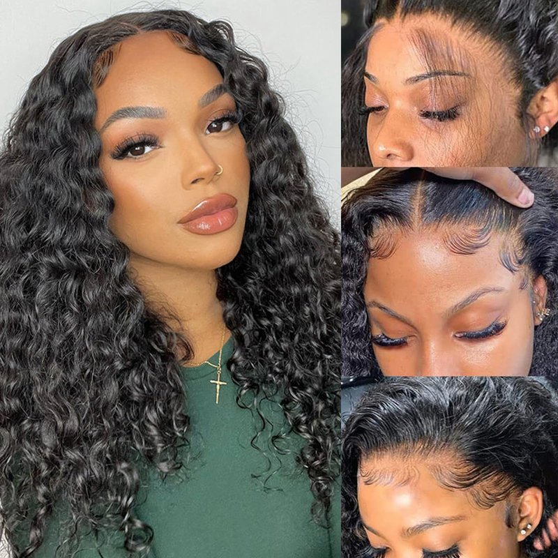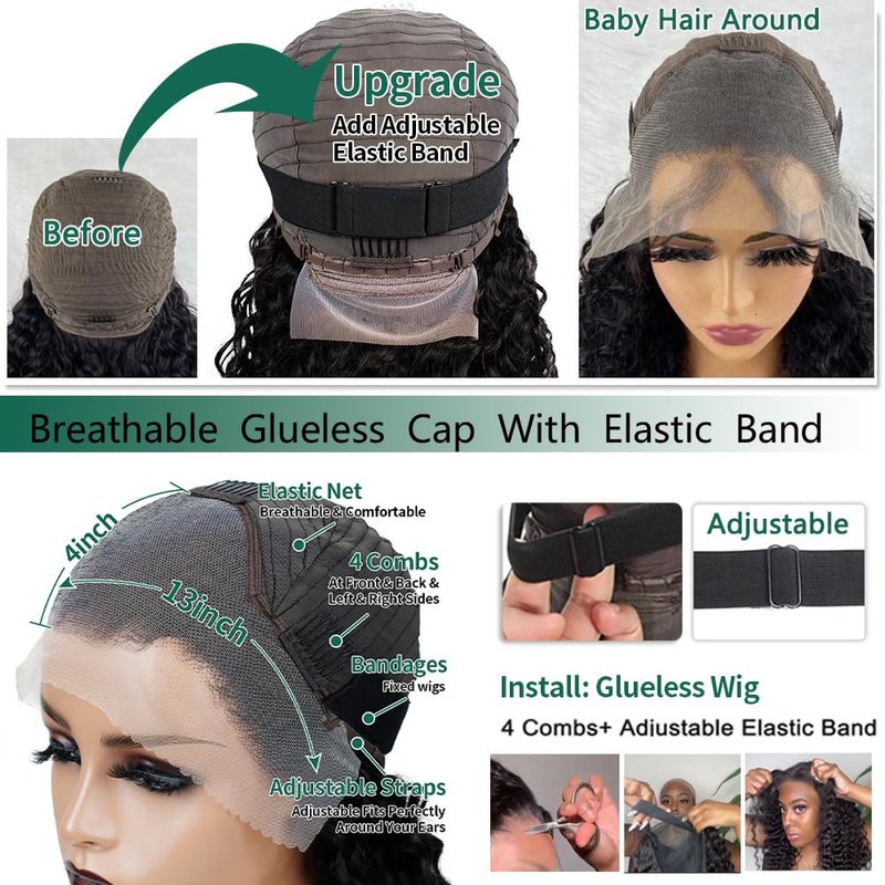 - 【💖Glueless Human Hair Wigs with Baby Hair】Deep wave glueless wigs human hair pre plucked, medium cap size(22 inch - 22.5 inch), breathable & durable lace material make it more comfortable, with 3 combs and two adjustable straps. Also, there is an adjustable band to help you wear the wig easily and quickly, which is so friendly to beginners.You can feel free to take it away without affecting the normal using of this no glue wigs.