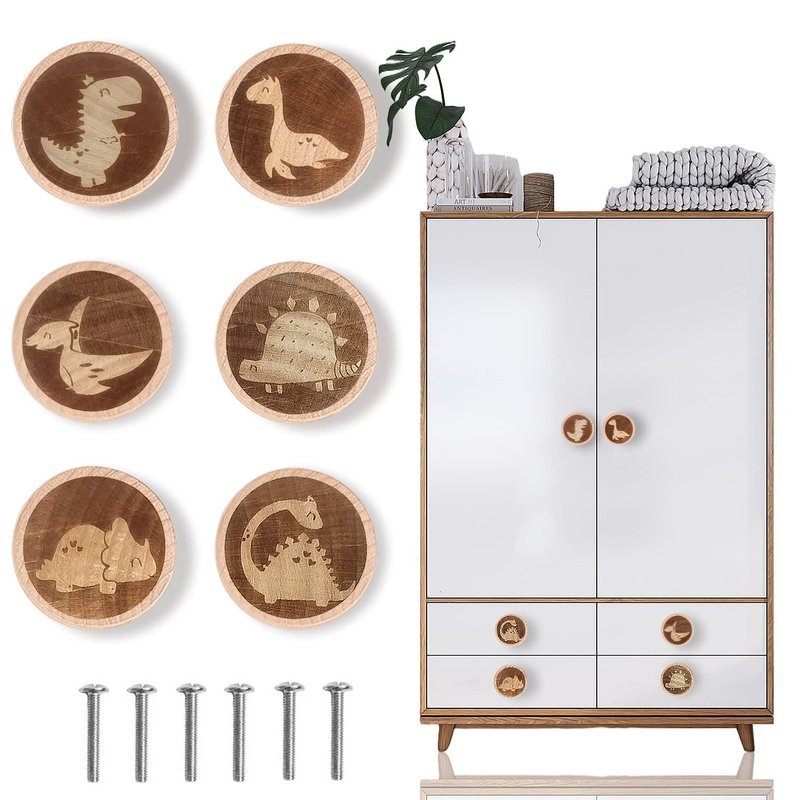 ziyue 6 Pack Wooden Drawer Knobs(40MM/1.57"), Dinosaur Wooden Knobs for Nursery Room, Kids Dresser Knobs Cabinet Pulls Handles with 6 Screws