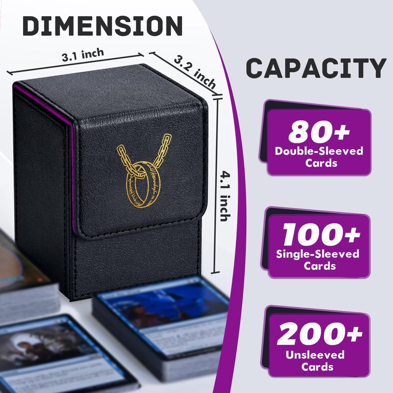 ZLCA Card Deck Box for MTG Cards with 2 Dividers, Card Storage Box Fits 100+ Single Sleeved Cards, PU Leather TCG Card Deck Case Holder for Magic Commander Yugioh (Black&Purple,Ring)