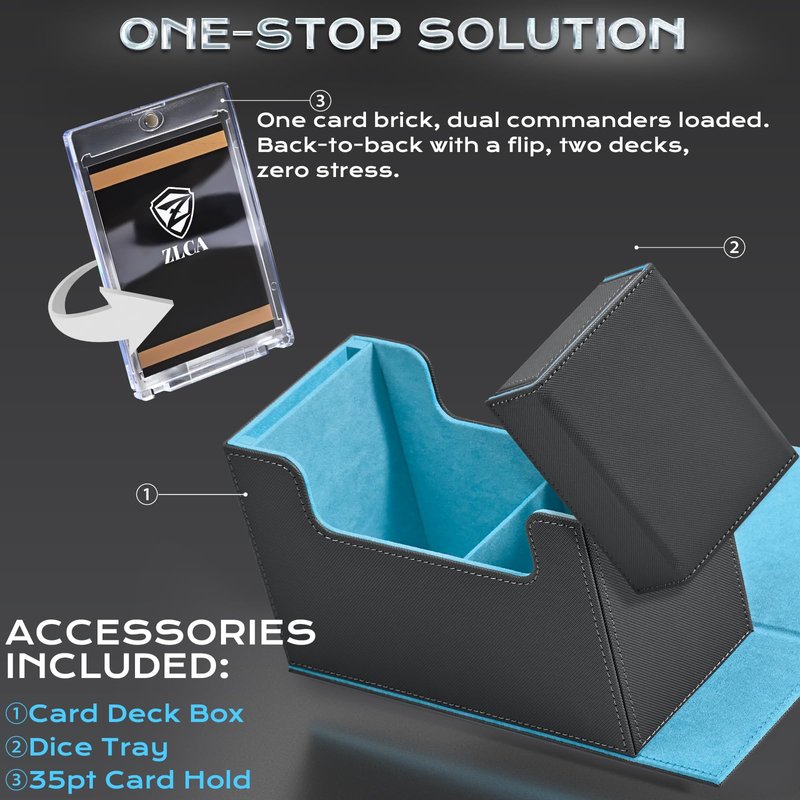 - 𝐃𝐢𝐜𝐞 𝐓𝐫𝐚𝐲 𝐚𝐧𝐝 𝟑𝟓 𝐩𝐭 𝐂𝐚𝐫𝐝 𝐁𝐫𝐢𝐜𝐤 𝐈𝐧𝐜𝐥𝐮𝐝𝐞𝐝:The ZLCA deck box not only prioritizes the safe storage of cards but also comes with a thoughtfully designed dice tray,adding a splash of color to your gaming experience.The magnetic 35 pt Card Brick not only offers additional protection but also allows for easy customization of Commander displays