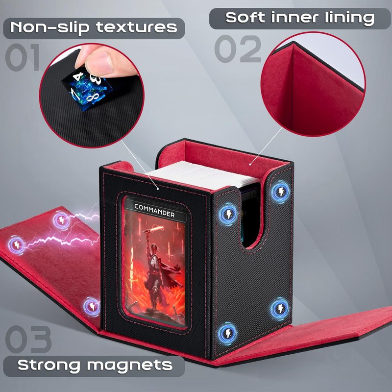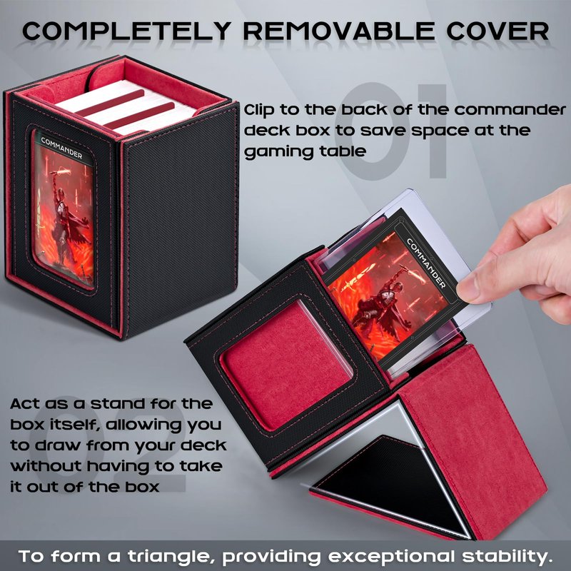- Patented Design:The display window on the lid adds a stylish touch to the deck box while allowing you to showcase your favorite card or artwork;This feature is especially appealing for collectors who want to display their prized cards(You can easily view the contents of the box without having to open)