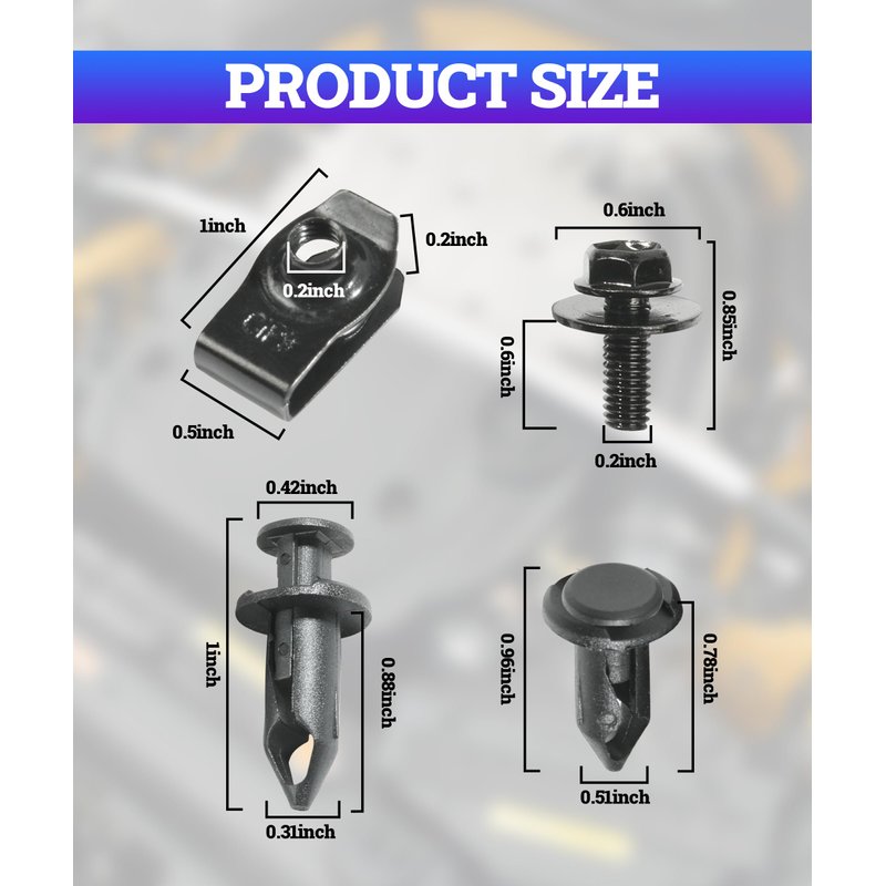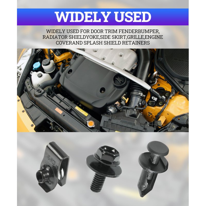 - [Essential] Universal body bolts suitable for cars, including screws and fasteners for installing the lower hood on the car. If you have an old car with fragile and rusty clips, this is a must-have.