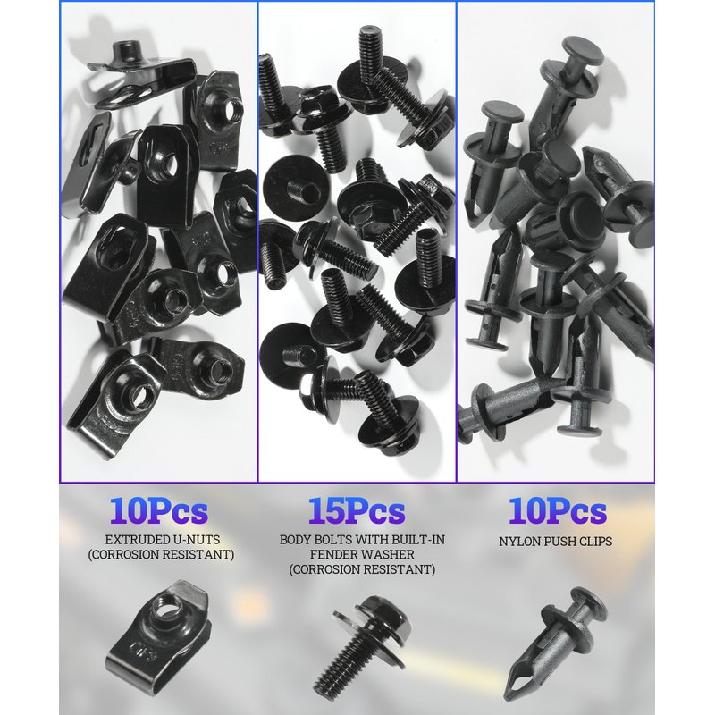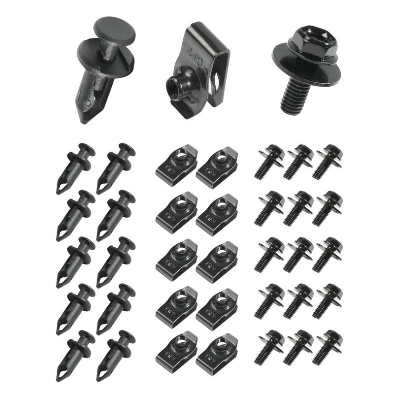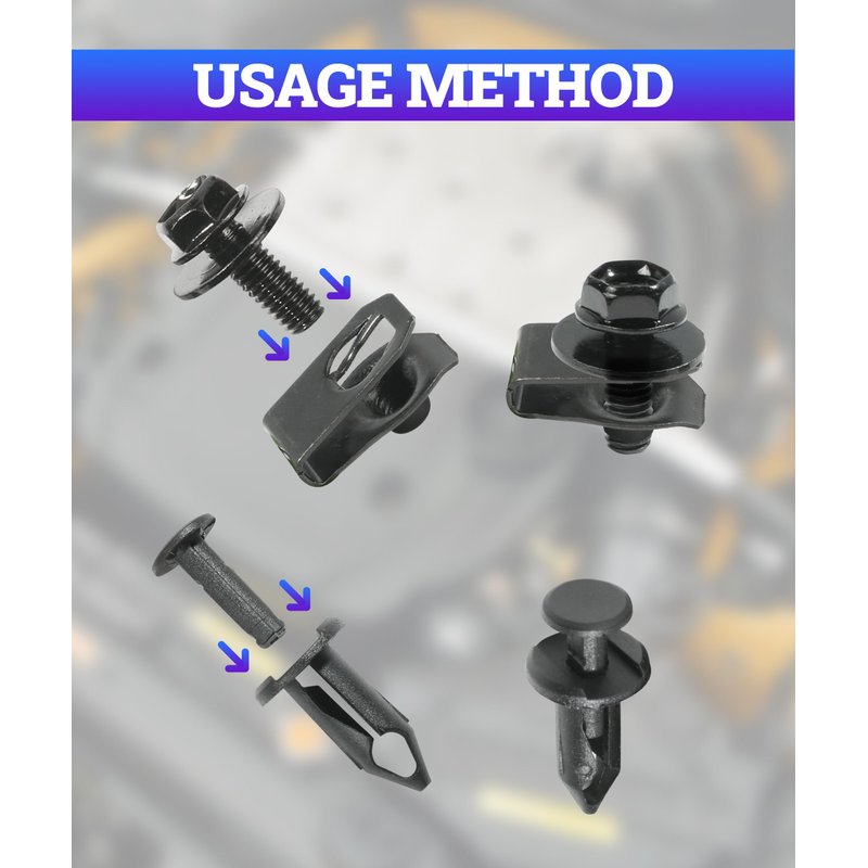 - [Package Includes]The car clip kit includes 10 extruded U-nuts, 15 body bolts with built-in fender washers, and 10 plastic push clips. Sufficient quantity to meet your daily replacement needs.