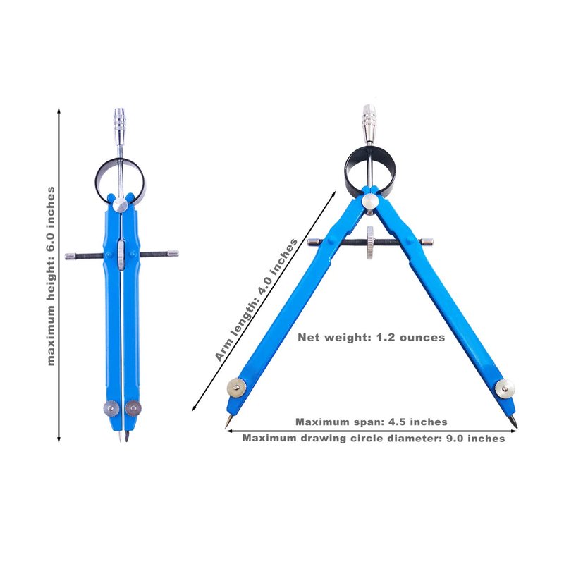 - The overall height of the compass is 6.0 inches, arm length is 4.0 inches, maximum span is 4.5 inches. Draw circles up to 9.0 inches in diameter