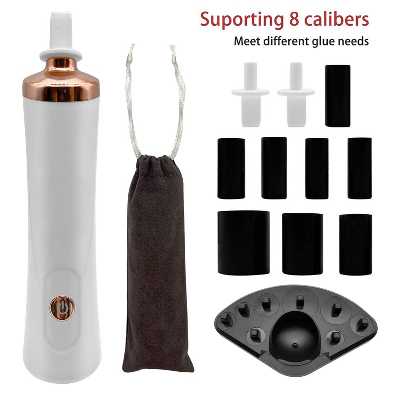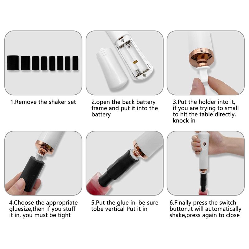- How to use: Take out the shaker, open the battery box on the back, and insert the battery. Squeeze the holder, if it is too weak, you can directly hit the table and knock in. Choose the proper caliber of the glue, then tuck it in. Put the glue in vertically, finally press the key to shake automatically, press it again to close.