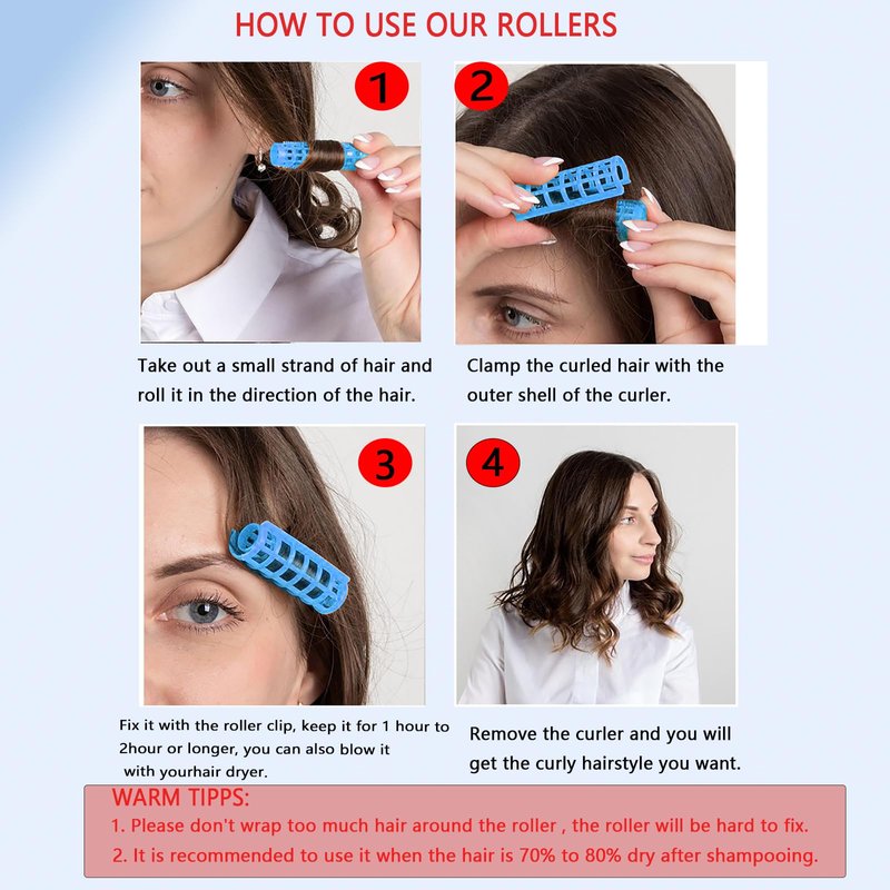 - No Heating: Our self grip plastic hair curlers do not require heating, you only need to separate a small section of slightly damp or dry hair, then spin the hair around the rods and fix it with clip,won't pull your hair, do no harm to the hair.