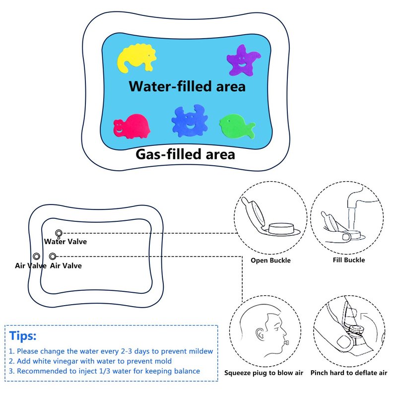 - 👶Easy to Use & Pack: Simple inflate baby activity mat outer ring and fill the middle part with water as a water tummy time mat. Or you can use 2 air valves to inflate air as an air tummy time mat. After use, dry and fold the baby toy into your bag to bring along anywhere! It would also be a best newborn baby gift for baby shower