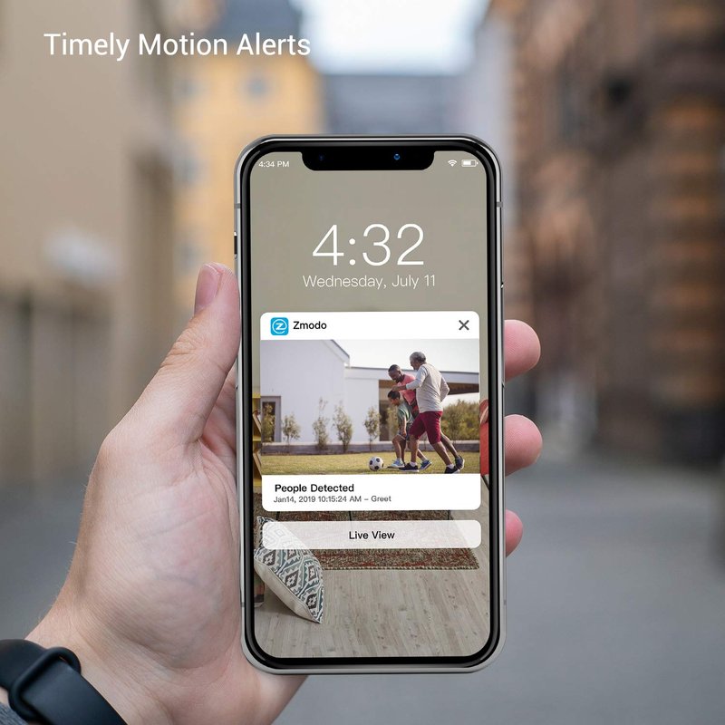 - Instant and Cloud-Based AI Motion Alert- Be notified instantly with a detail image alert pushed to your mobile phone when the Zmodo outdoor security camera detects an unexpected motion. You can customize the motion detection zone and mode to only receive alerts of places that matter and at time that needed. What’s more, when subscribing to cloud service, the camera can identify human, pets and vehicles so that you can further filter and reduce false alerts