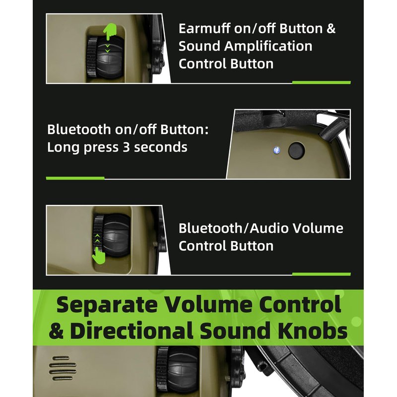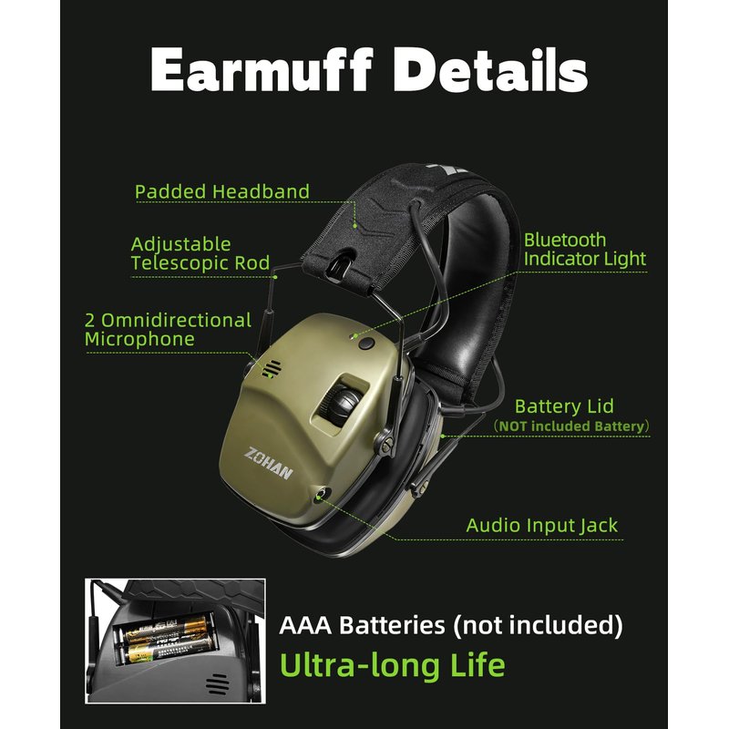 ZOHAN Shooting Earmuffs with Bluetooth Technology Actively listens & Noise Reduction A versatile pair of bluetooth electronic shooting hearing protectors that function great indoors and outdoors and come with separate volume control that allows you to adjust the volume of music and the ambient noise around you independently.