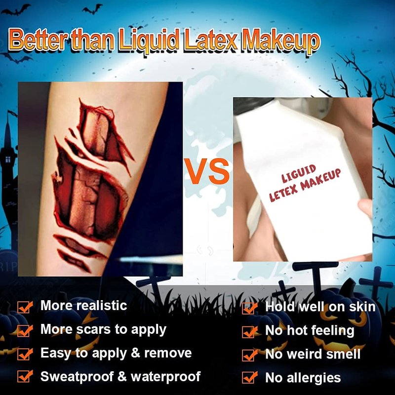 Compared to Liquid Latex makeup, HANPURE zombie makeup kit tattoos are more realistic, more scars to apply, more easy to apply/remove, sweatproof & waterproof and Hold much well on skin. No hot feeling, no weird smell, no allergies, absolutely the solution for zombie fake blood makeup kit.