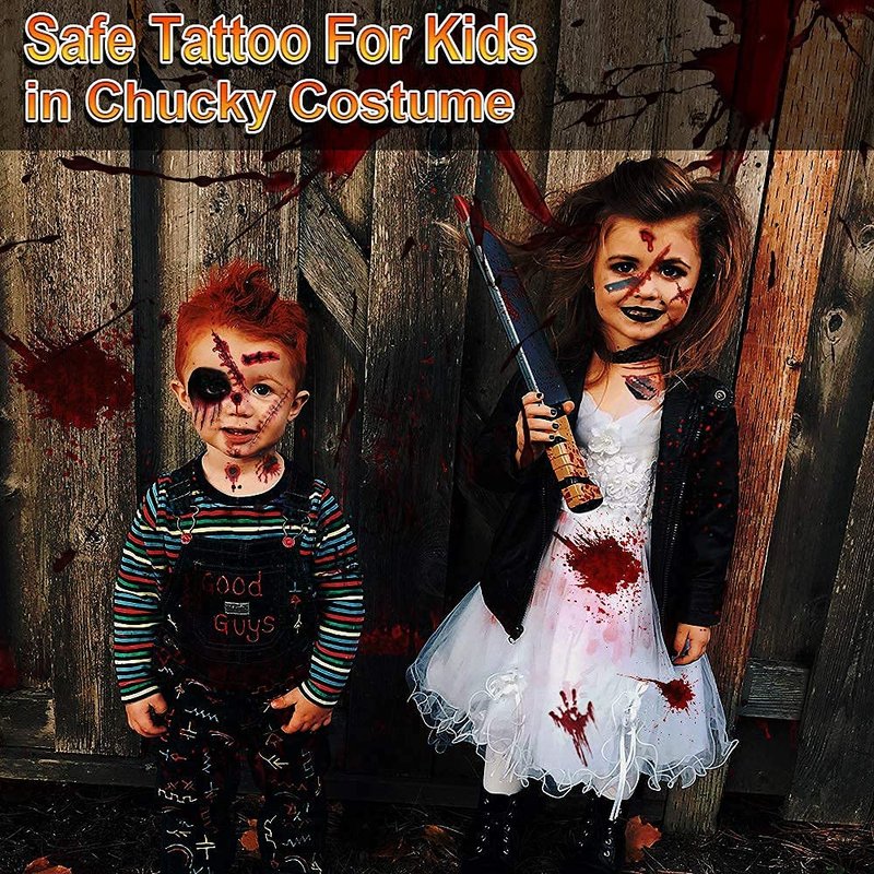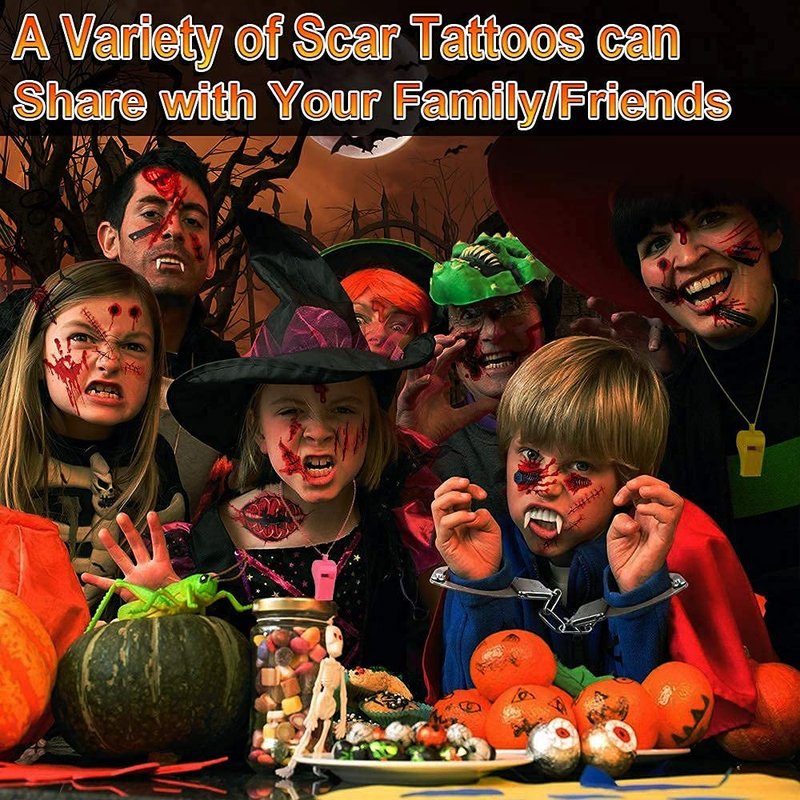 - Surprisingly Real: Halloween Zombie Makeup Tattoos of fake blood, fake scars, fake cuts, fake injury, designs are pretty realistic,you can add a little blood to make it more “real”. Great scar zombie tattoos for your costumes. Perfect for trick or treating.perfect zombie tattoos for Zombie makeup kit, Halloween zombie makeup kit for kids adults, or vampire bite makeup tattoo cosplay and more parties.