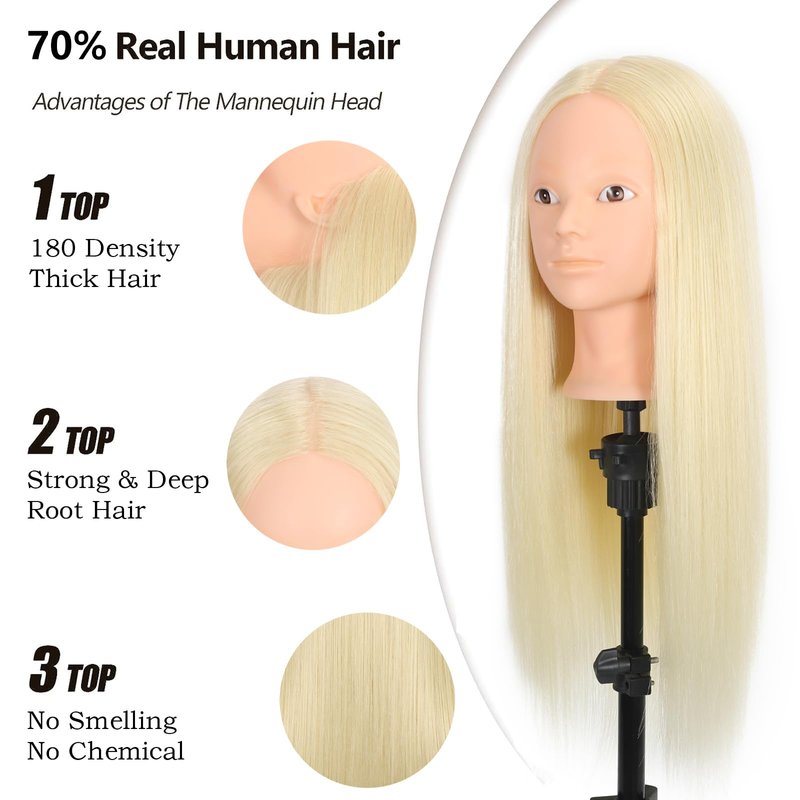 - Healthy Material:The cosmetology mannequin head has 70% real human hair.It is equipped with realistic hair seams and hair volume,and the texture is soft.Just like real hair,you are free to design the hair style as you like