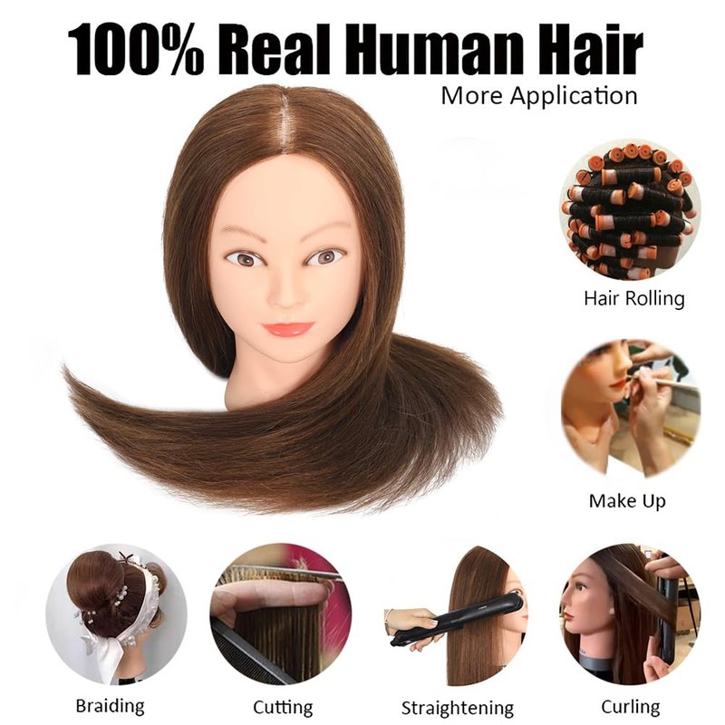 ZOMOI Mannequin Head with 100% Real Human Hair, Cosmetology Mannequin Doll Head for Styling Hairdresser Practice Training Head (Brown)