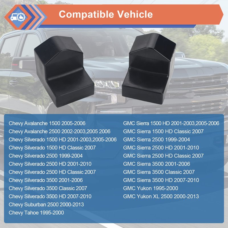 - Compatible Vehicle - Control Arm Bumper compatible with 1999-2000 Cadillac Escalade; Chevy 2002-2006 Avalanche, 2001-2006 Silverado 1500 HD, 1999-2004 Silverado 2500, 2001-2010 Silverado 2500 HD, 2001-2006 Silverado 3500, 2007-2010 Silverado 3500 HD, 2000-2013 Suburban 2500, 1995-2000 Tahoe; GMC 2001-2006 Sierra 1500 HD, 1999-2004 Sierra 2500, 2001-2010 Sierra 2500 HD, 2001-2006 Sierra 3500, 2007 Sierra 3500 HD Classic, 2007-2010 Sierra 3500 HD, 1995-2000 Yukon, 2000-2013 Yukon XL 2500.