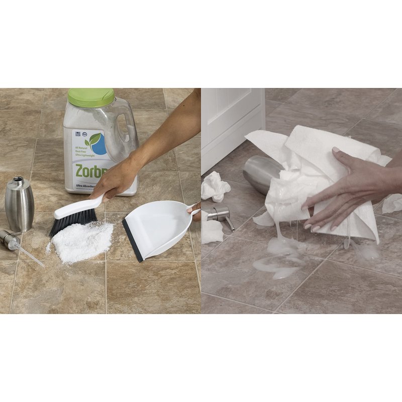 - 16X MORE ABSORBANT than other powders, heavy bags of clay or cat litter. Zorbent works on all surfaces - tile, carpet, concrete, steel, wood, even porous and rough surfaces. Easily removes all liquids like water, juice, urine, vomit, blood, BBQ sauce, oil and a lot more.