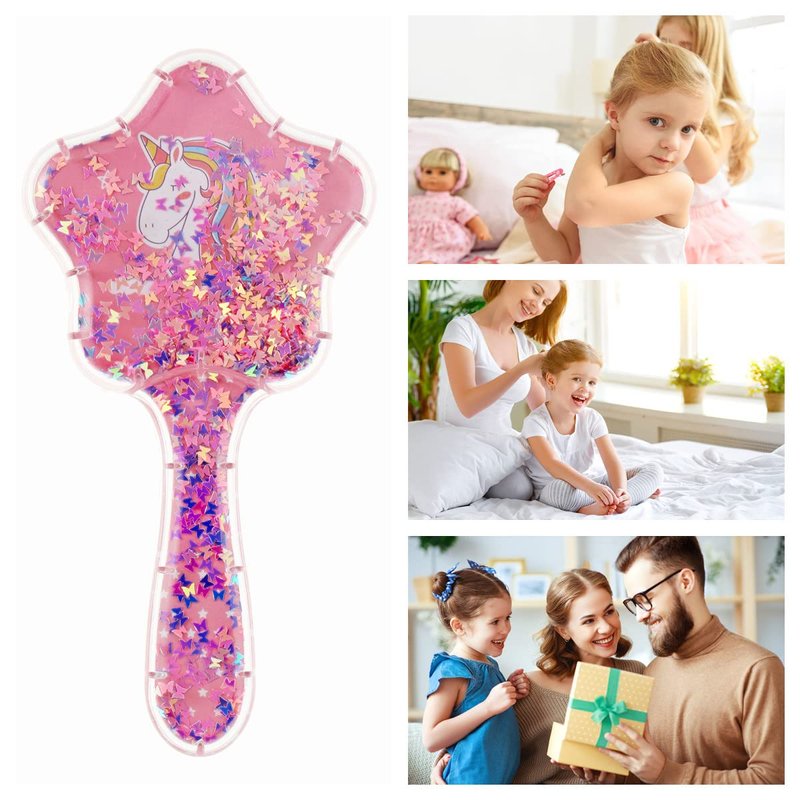 - [Unicorn Gifts for Girls]: This pretty and cute unicorn hairbrush is loved by children. It has a star shape and features a fun shakeable bling butterfly that moves while you brush.The comb does not contain any liquid.
