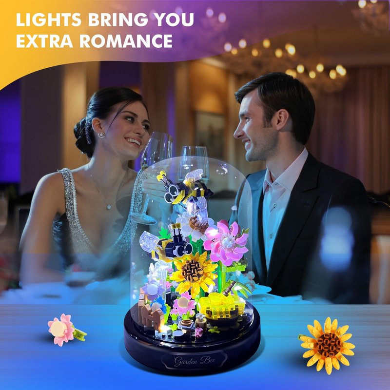 - LIGHT UP FLOWER BEE BOUUQUET BUILDING SET The flower bouquet bee building set comes with LED string light, installing the LED string light after assembling the flower building set, which makes the set bright and beautiful at night. The light not only makes the set more charming, but also bring you the happiness and romance.