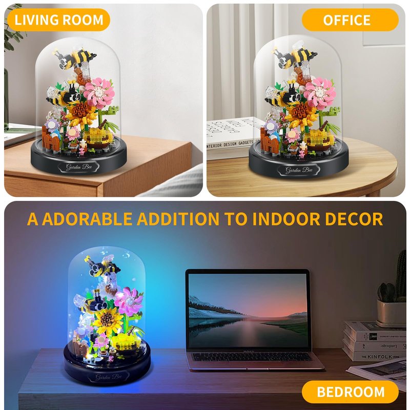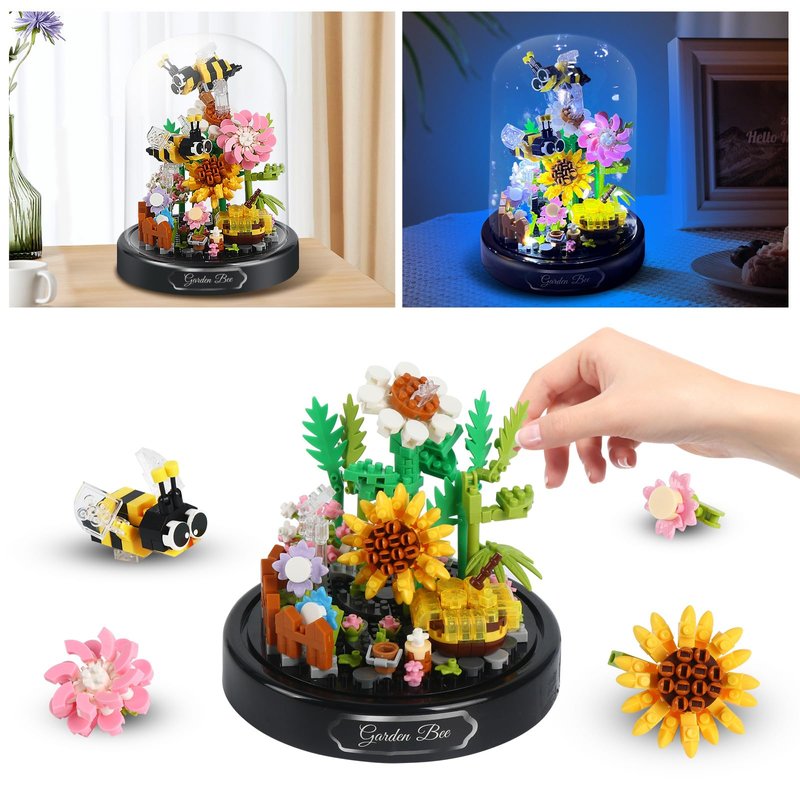 - FLOWER BEE BOUQUET WITH COVER FOR DECORATION The flower bouquet bee building set was the perfect combination of bee and flower, the cute bees and lots of flower variety, which is a very fun combination design and looks like the artwork. The design comes with the nice base and glass to be able to display, and the transparent cover is a big plus and keeps dust and fingers away from this nice display,it's a great craft for decoration.