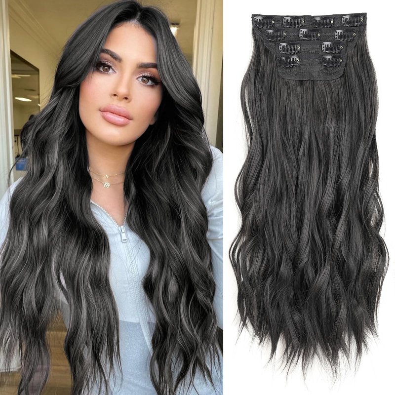 ZRQ 4PCS Clip in Hair Extensions 20 Inch Black Long Wavy Synthetic Fiber Hair Synthetic Hairpieces Bouncy Curly Hair Extensions for Women Full Head (Black, 20 Inch)