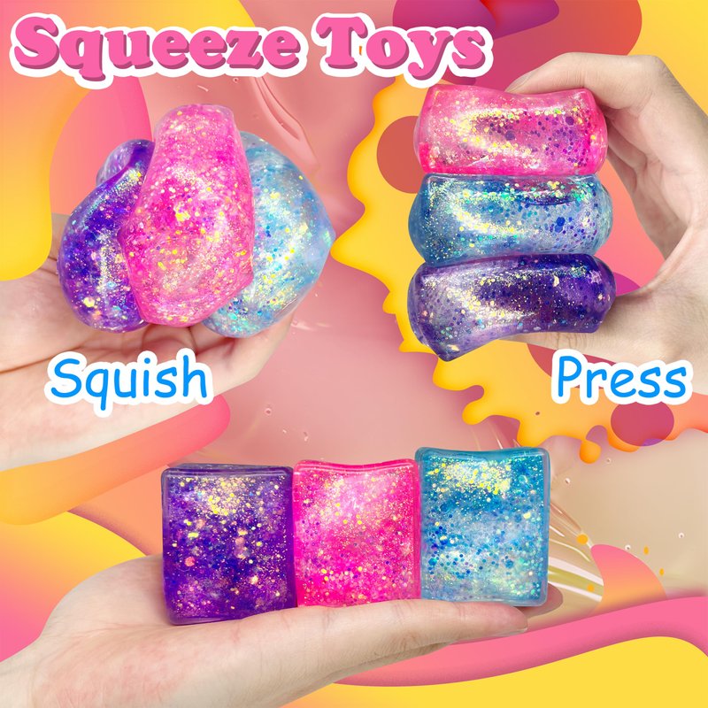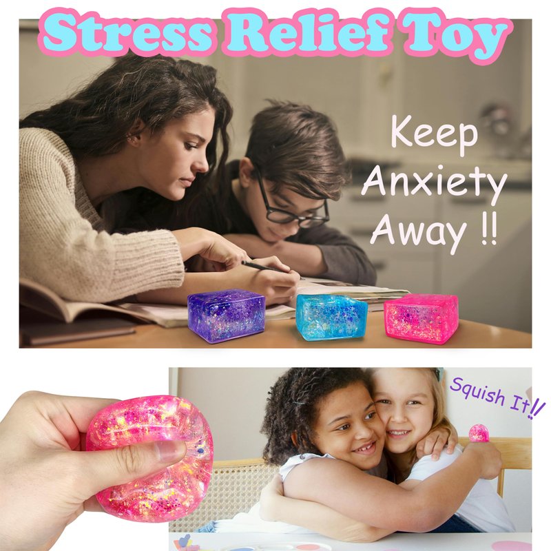 - 【Great Gifts & Party Favors】 This stress cube squishy toys with a small amount of glitter inside becomes a popular party favors and party decoration for glitter lovers, and great stress balls for kids. It makes a beautiful stress relief toy for glitter lovers or people who need to calm down from time to time. Party toys, suitable for Party Favor Bags Stuffers, Birthday Gifts, Christmas gifts, Easter Basket stuffers and School Classroom Rewards.