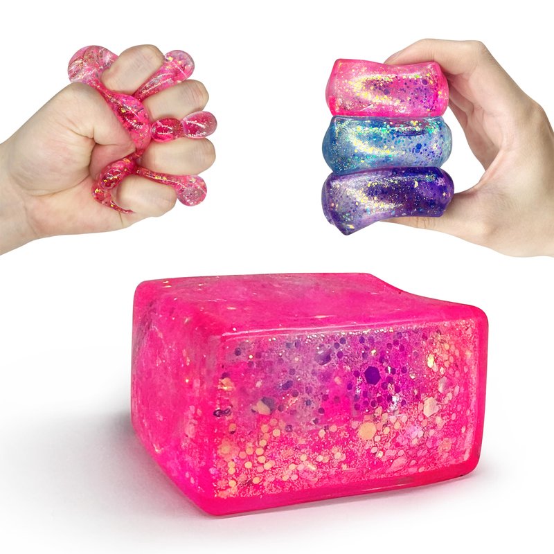 - 【Funny Ice Cube Toys】 Fun ice cube shaped stress ball available in pink blue purple in three bright neon jelly colors. As well as giving you a new squeezing sensation, feel its softness when pressed slowly and when pressed quickly he will give you feedback on the hard side. Not only does it come in bright colors, but the inside of the stress ball is lined with glitter.