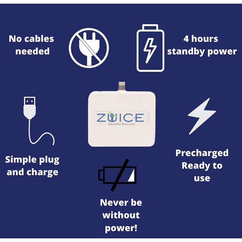 ZUICE is a one-time-use disposable phone charger that provides an on-the-go convenient way to charge smartphones and iPads for anyone that needs a quick charge. These powerful electronic accessories come pre-charged and have a capacity of 1500mAh. These charges can give your phone up to 50% more battery strength in as little as 2 hours through a full, continuous charger and connects directly to your mobile device with no attached cord. ZUICE is great for teenagers who need a charged phone, stocking stuffers for safety, and makes a great phone accessory. ZUICE can take a dead phone to functioning power in times of emergency or inconvenience quickly with no hassle. No cords, power supply, power source access needed, so ZUICE is ready when you need it most!