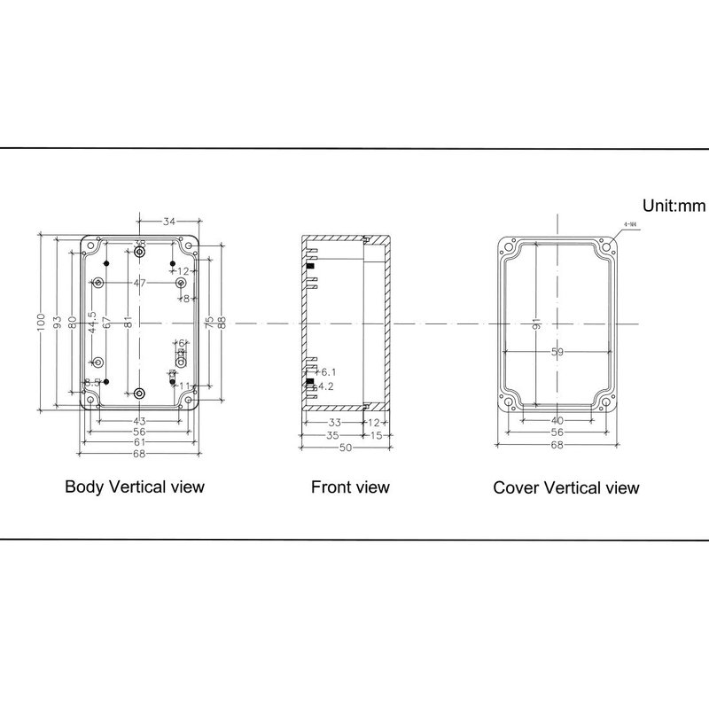 - Outer Size of project enclosure: 3.94" x 2.68" x 1.97"(100X68X50mm)(L*W*H); Inner Size of electronic enclosure: 3.7" x 2.4" x 1.7"(93X61X44mm)(L*W*H)- - (Allowable Error: ±2mm)