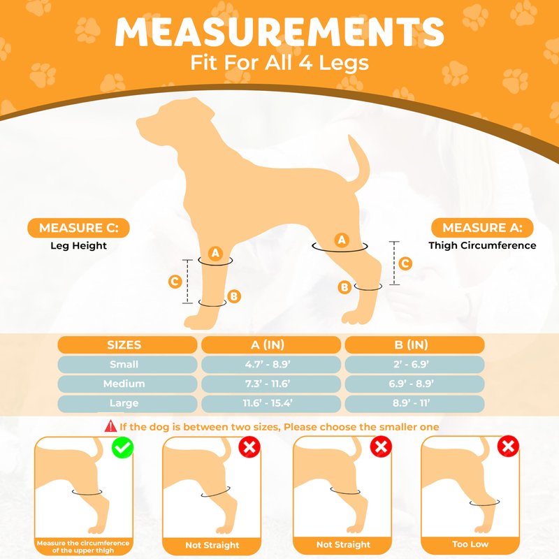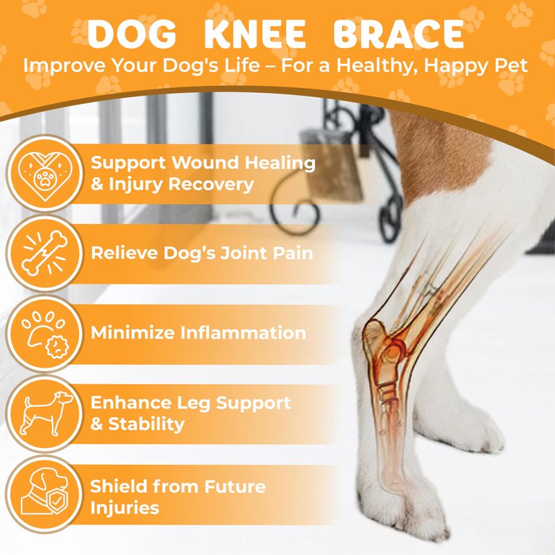 (This product isn’t meant for dogs that have thick hair. Please note product may slip if your dog is highly active) Alleviate Leg Pain and Improve Recovery or Support Efforts with a Knee Brace Designed for Dogs (GET ONE SIZE SMALLER FOR A BETTER FIT) While it’s common for dogs to struggle with hip dysplasia, knee injuries, and even arthritis, it doesn’t mean you can’t help easing those discomforts and get them back on the road to recovery faster. That’s why we developed the [Brand] Dog Knee Brace with enhanced spring support that stabilizes the joint, muscles, and ligaments when they’re walking, running, or even playing. Offering soft, breathable, lightweight support that adjusts to fit your dog’s leg—without pulling the hair or irritating the skin—these neoprene leg braces provide active recovery where it’s needed most, so you can keep your dog active, healthy, and happy. Product Details: Back Leg Dog Knee Brace (Universal) Supports Daily Mobility or Injury Recovery Lightweight, Breathable, and Adjustable Helps Minimize Bending Movement Machine Washable Neoprene Fabric Available in Small, Medium, or Large Designed for Right and Left Rear Legs