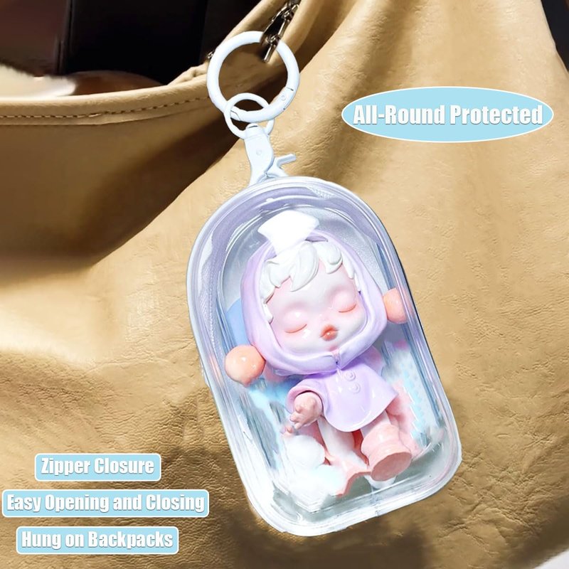 Zurtoki 2 PCS Clear Figure Display Bag with Keychain,Clear Keychain Pouch,Blind Box Display Case,Carrying Case for Doll,Dustproof Waterproof Doll Storage Bag Hanging Organizer Zipper Case(2pcs Cabin)