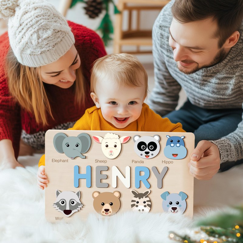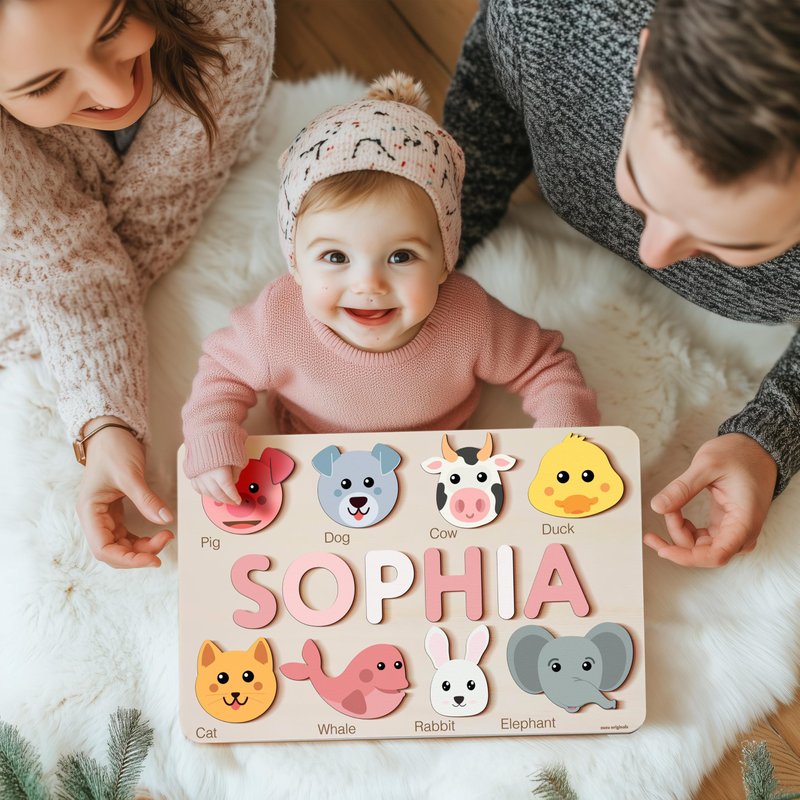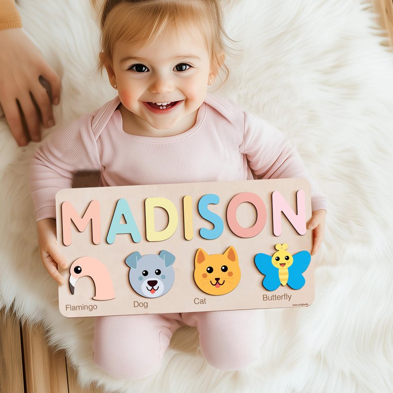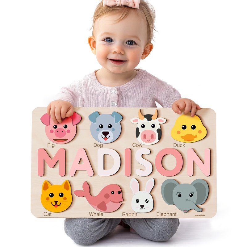 Zuzu Puzzle Personalize Name Puzzle for Toddlers with Animals, Baby Gift for Girls and Boys 0 1 2 3 Year Old, Personalized Puzzle for Kids, 1 Year Old Girl and Boy Kid Gifts, Customized Baby Gift, Montessori Educational Name Toy, Wood Puzzle 1-3