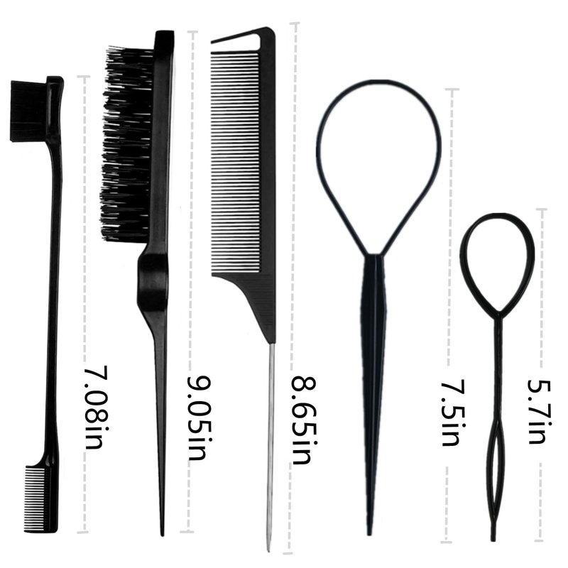 - 1:[The Perfect Hair Styling Tools]: These black hair loop styling tool set includes 4pcs Topsy Tail Hair Tools pony tail hair tool, french braid tool loop,1pcs hair brush, bristle hair brush,1pack double-sided edge brush,and 2pcs carbon fiber heat resistant rat tail combs. This black comb set is perfect for women who love beauty.