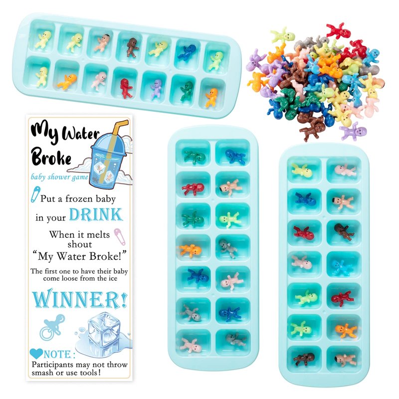 - My water broke baby shower game set: 60 mini plastic babies, 3 green ice cube trays, 1 Sign(as the picture shows). Packed in a thick cardboard box, the item will not be damaged or deformed