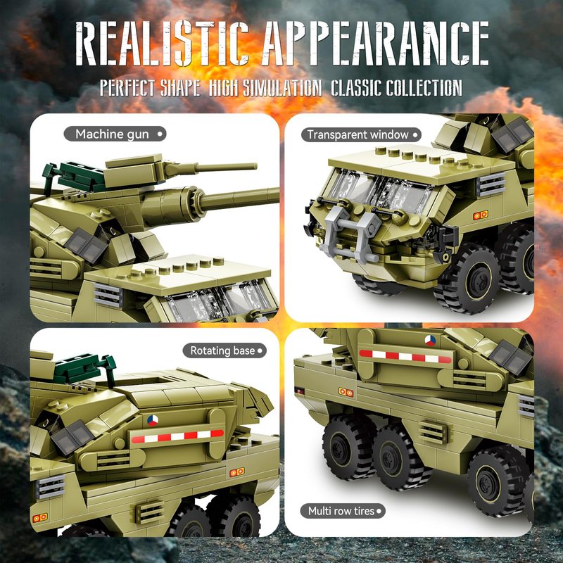 - 【Classic appearance】ZYLEGEN's latest release of armored vehicles building Block adopts the classic appearance of the Dana M2 armored vehicle, with its design and color faithfully recreating the handsome exterior of the realistic Dana M2 military car. From the tires to the turret, ZYLEGEN meticulously replicates every detail, transporting you back to the real battlefield