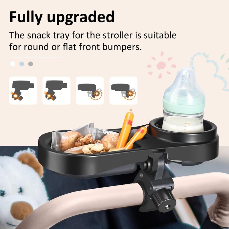 - [Compatible with Almost All Strollers] The stroller tray has undergone a complete upgrade, making it compatible with various types of baby strollers that have round and flat front bumpers. And it can be easily rotated in the direction you desire by pressing a button.